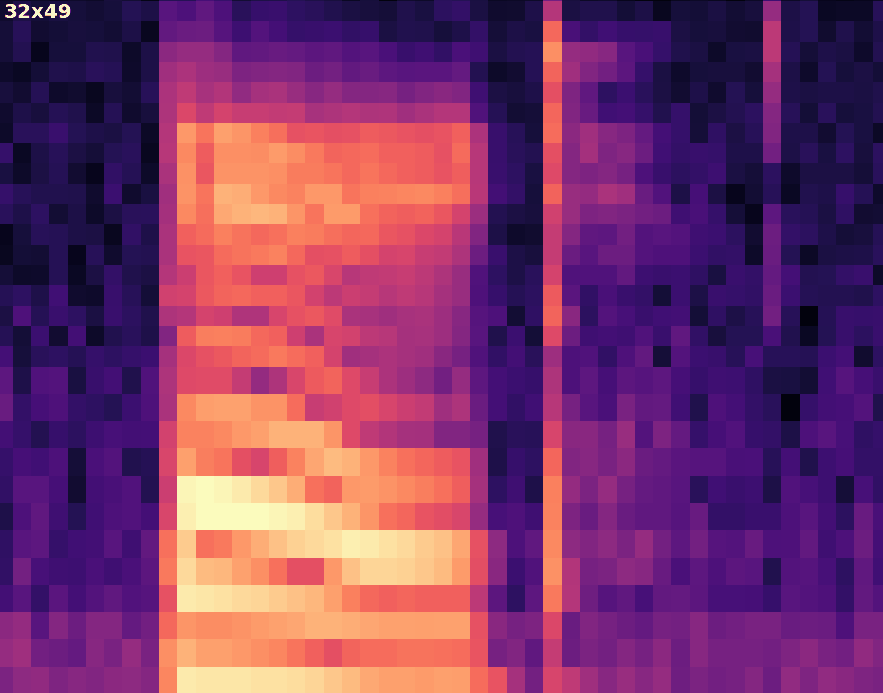 The following video shows a 1s audio sample being processed in increments of 400ms. So the ML model "sees" the same audio sample shifted by 400ms. 400ms is the simulated amount of time it takes the embedded device to generate the spectrogram and process it in the ML model. In this case, there are few predictions in the running average giving low confidence of a keyword detection.