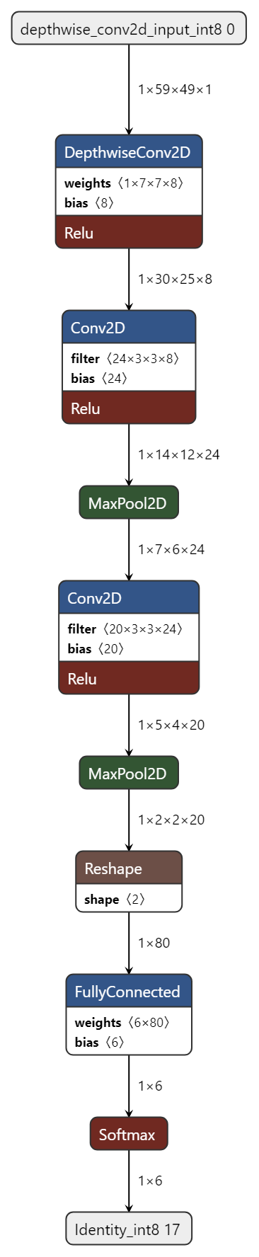 | 0 | depthwise_conv_2d | 59x49x1 (int8) | 30x25x8 (int8) | Multipler:8 padding:same stride:2x2 activation:relu |