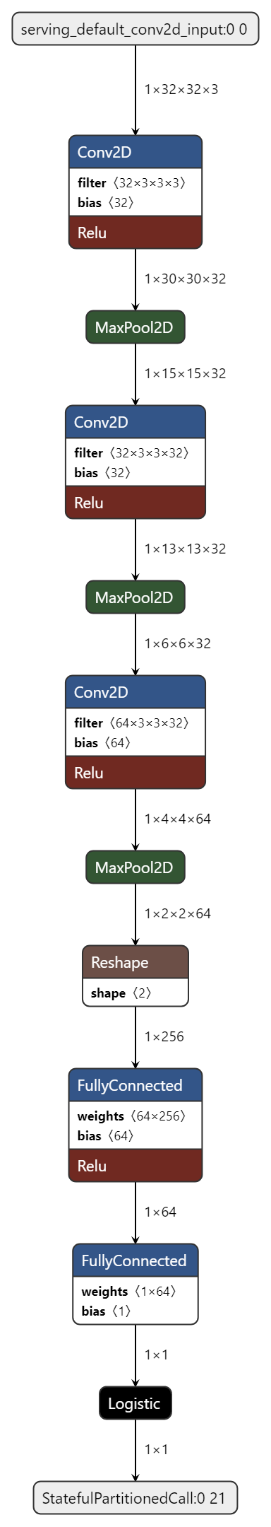 | 2 | conv_2d | 15x15x32 (int8) | 13x13x32 (int8) | Padding:valid stride:1x1 activation:relu |