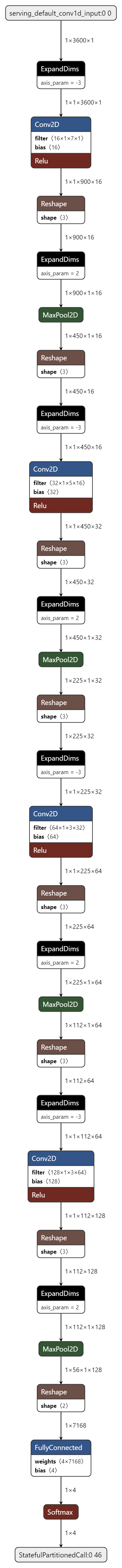 | 1 | conv_2d | 1x3600x1 (int8) | 1x900x16 (int8) | Padding:same stride:4x1 activation:relu |